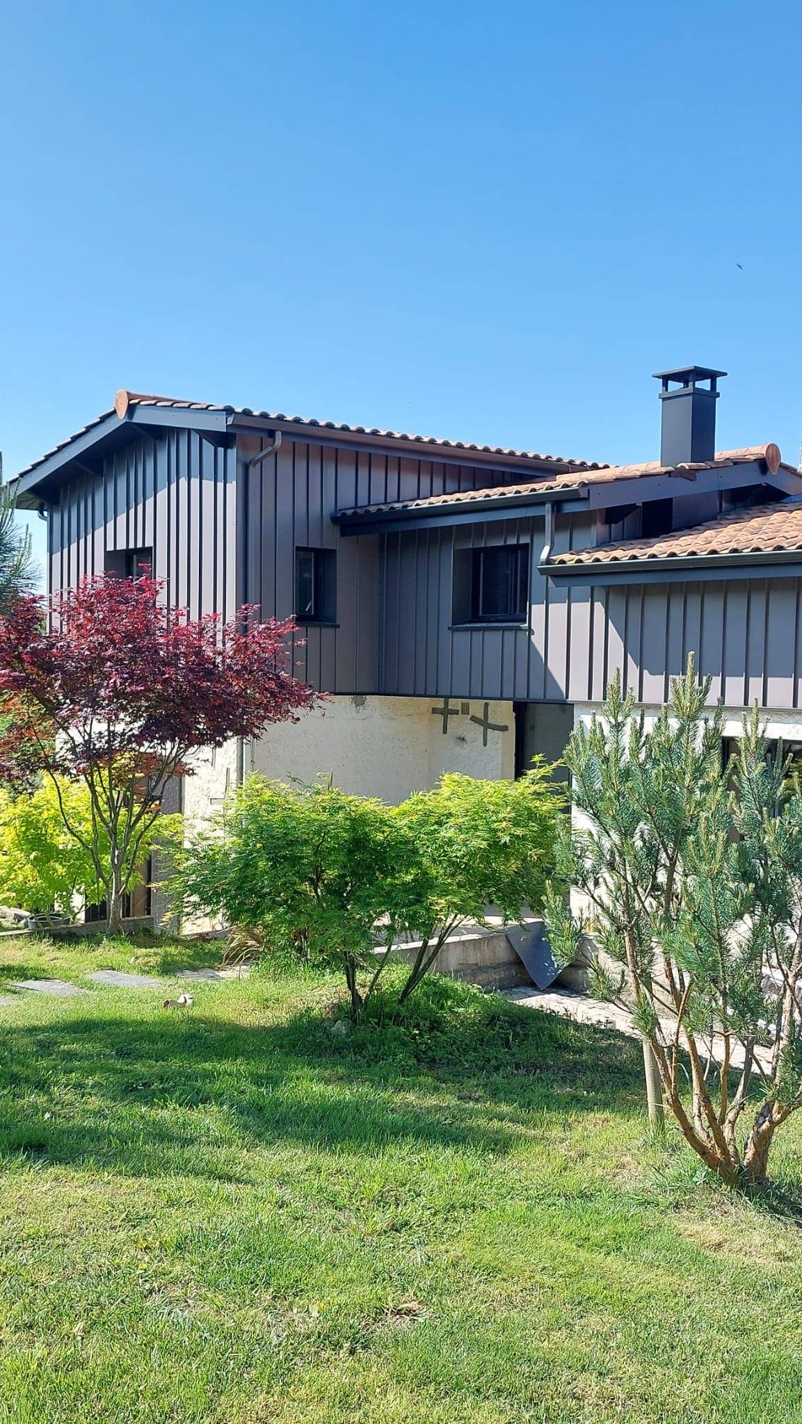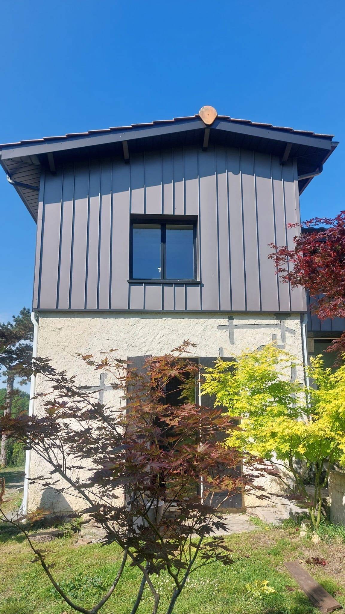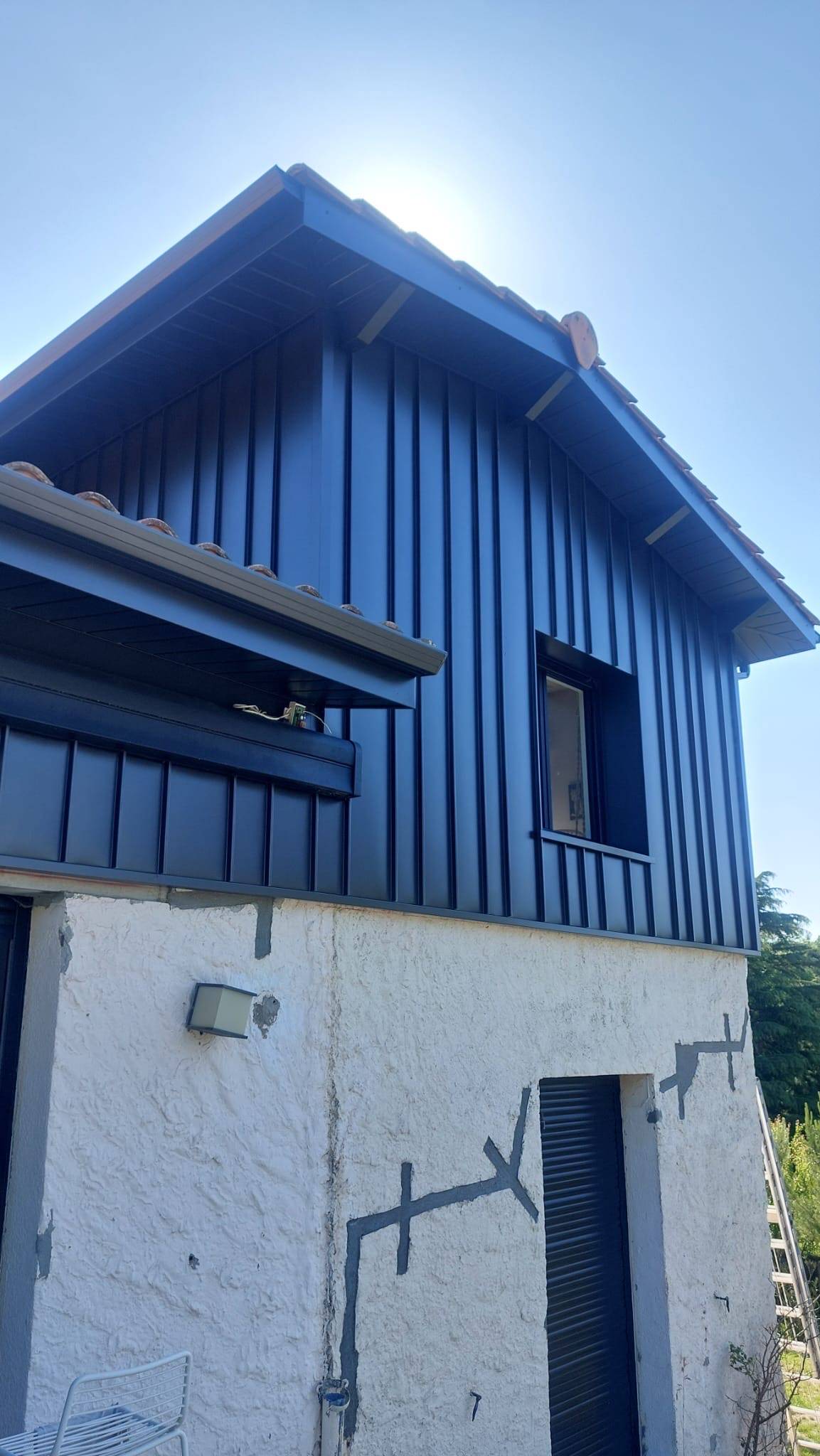 Dans ce projet, chaque élément a été pensé pour créer une harmonie visuelle tout en assurant la protection du bâti. Le bardage joint debout, posé sans vis apparente, donne à la façade un rendu moderne, épuré, parfaitement intégré dans le cadre de Génissac. Le choix du bronze apporte une touche chaleureuse et originale, se démarquant des coloris plus traditionnels.